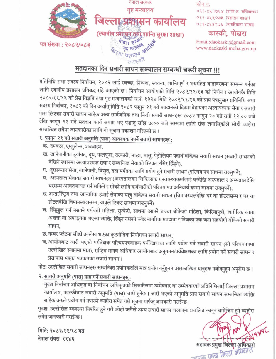 मतदानका दिन सवारी साधन सञ्चालन सम्बन्धी जरुरी सूचना ।