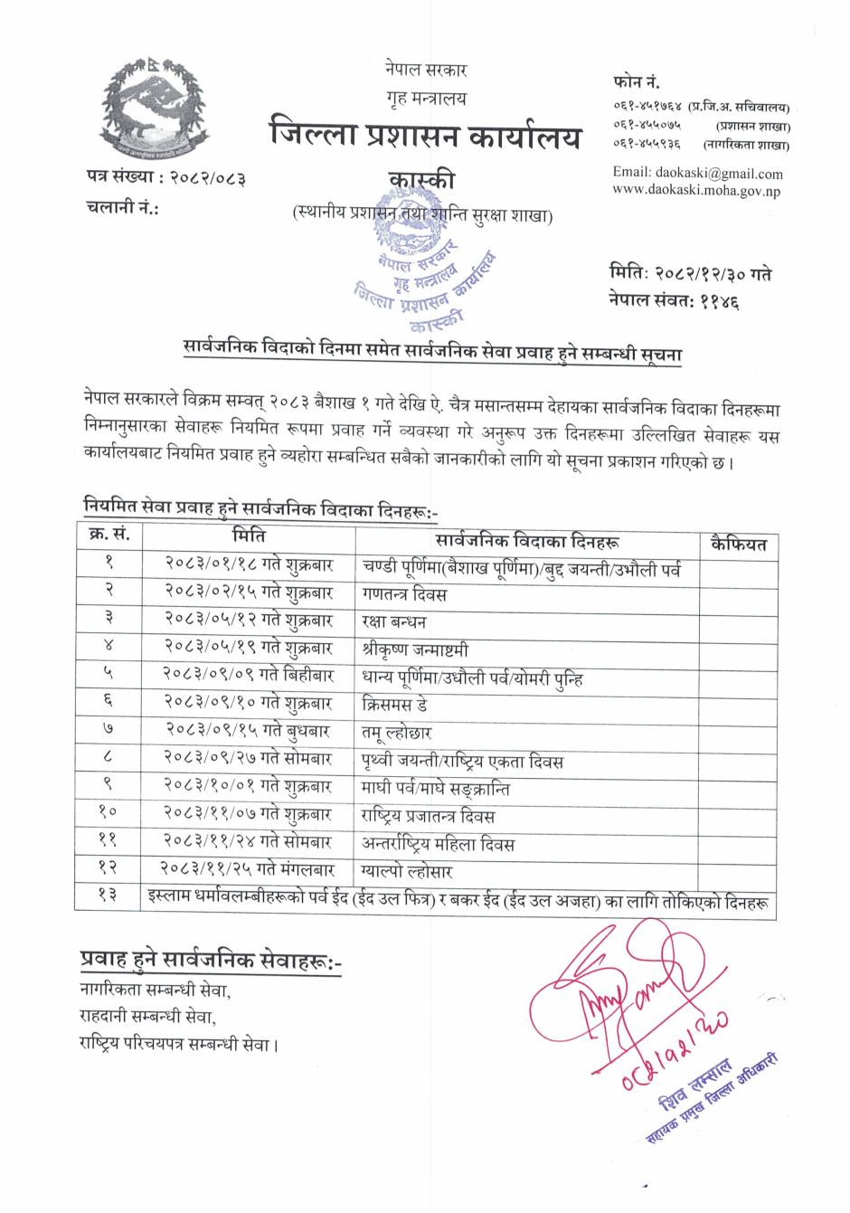 सार्वजनिक विदाको दिनमा समेत सार्वजनिक सेवा प्रवाह सम्बन्धी सूचना ।